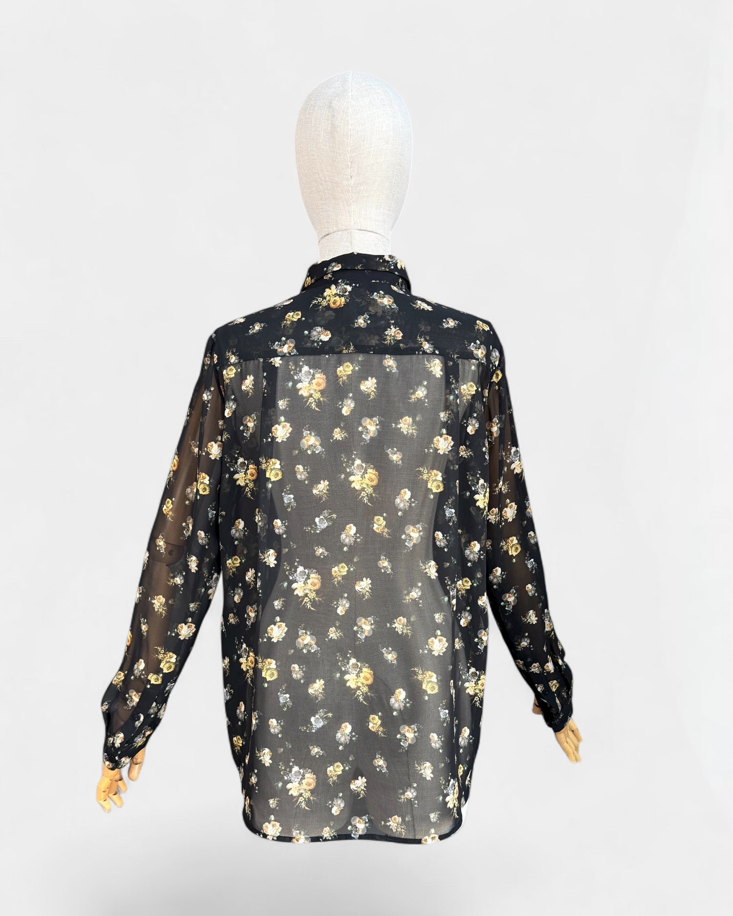 Chemise The Kooples en voile noir transparent avec petits motifs fleuris. Coupe droite et légère, agréable à porter. Peut se mettre avec un débardeur dessous ou portée seule.