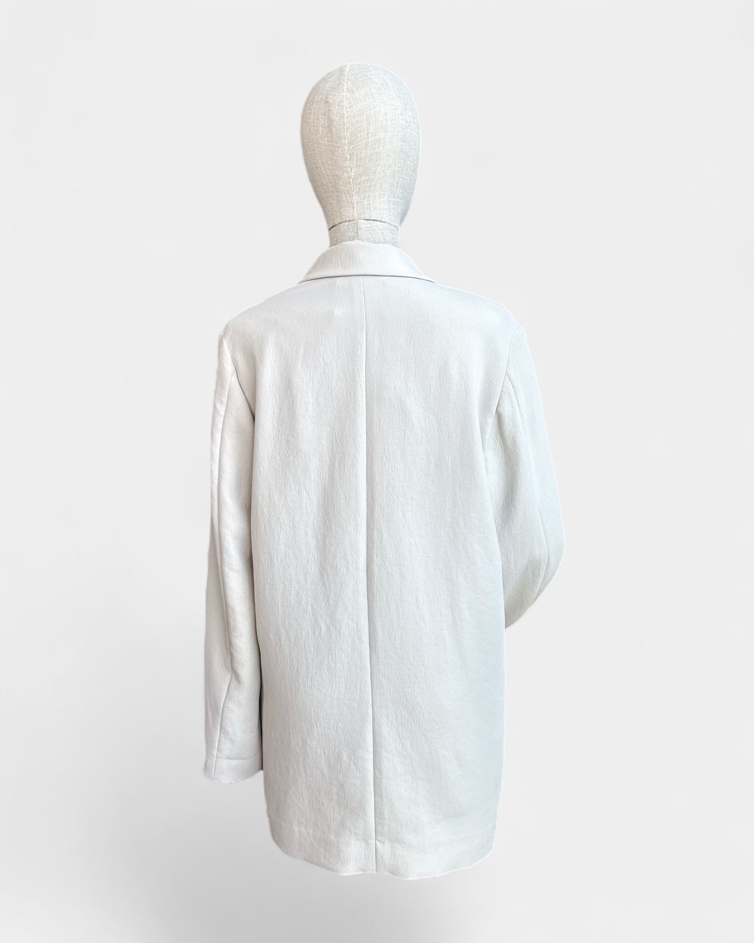 Wilfred oversized blazer in off-white, featuring a straight, elegant fit. Featuring a double-breasted fastening with contrasting black buttons, flap pockets, and a classic tailored collar. A chic and timeless staple, perfect for mid-season.