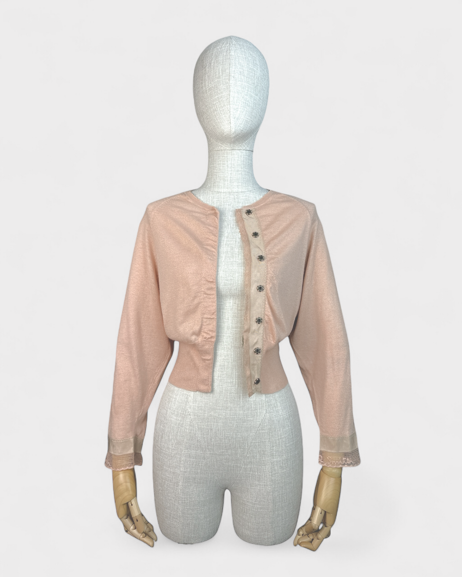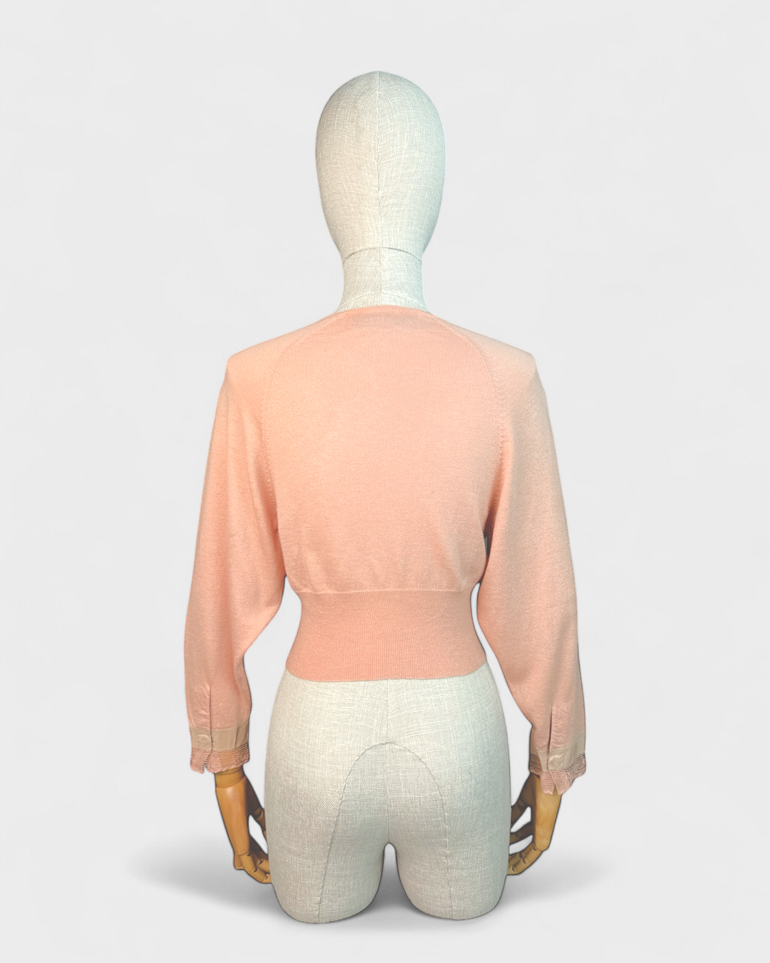 Cardigan mélange soie et cashmere. Ce vêtement présente une coupe légèrement ample au niveau des manches et ajustée à la taille, ce qui crée un effet structuré et flatteur. De couleur nude ou beige rosé, il se distingue par une fermeture asymétrique ornée de boutons délicats, ajoutant une touche originale et raffinée. Les poignets comportent des détails de finition avec une bande de tissu légèrement transparente et décorative.