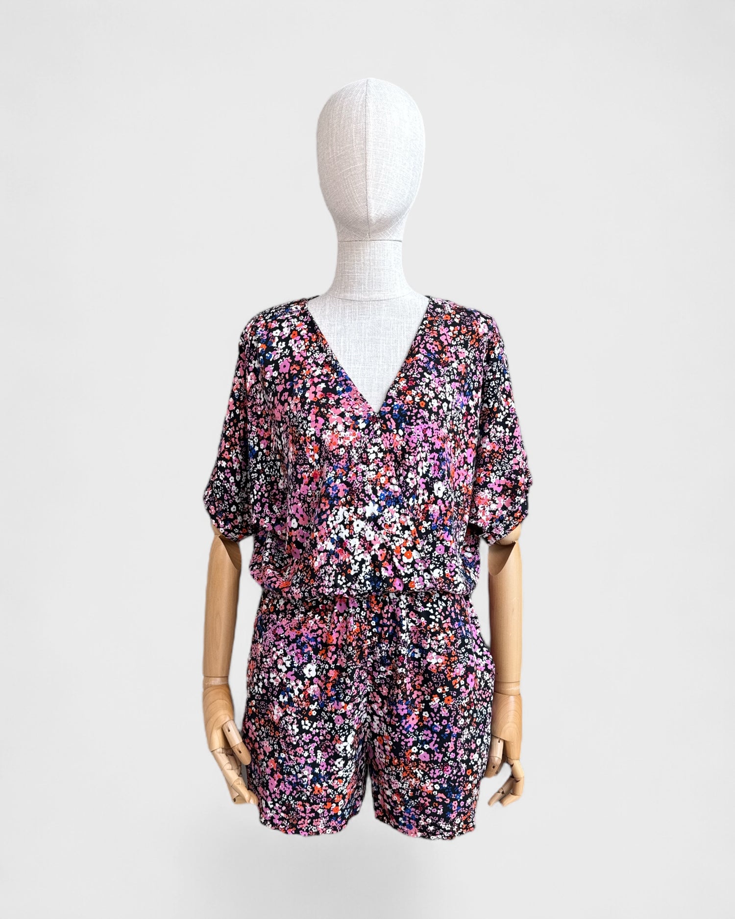 Combi-short Maje fleurie, coupe fluide et décontractée. Imprimé floral multicolore sur fond noir, manches courtes, taille élastiquée et poches pratiques. Ultra confortable, idéale pour les beaux jours.