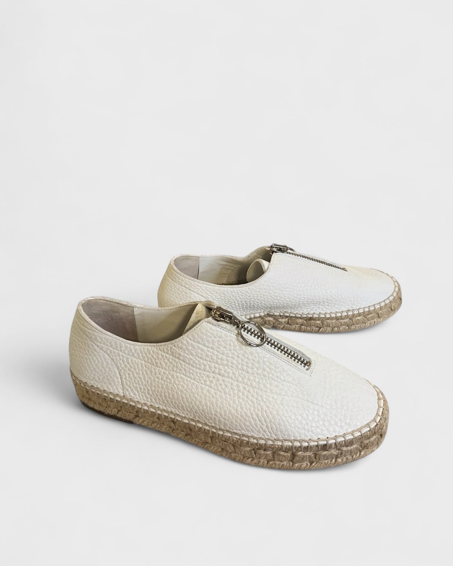 Espadrilles en cuir blanc grainé signées Alexander Wang. Modèle fermé avec fermeture zippée à l’avant, orné d’un anneau métallique. Semelle en corde tressée typique des espadrilles, pour un style estival et moderne. Fabriquées en Espagne, semelle extérieure en cuir avec signes d’usage. Un mélange chic de décontraction et de sophistication.