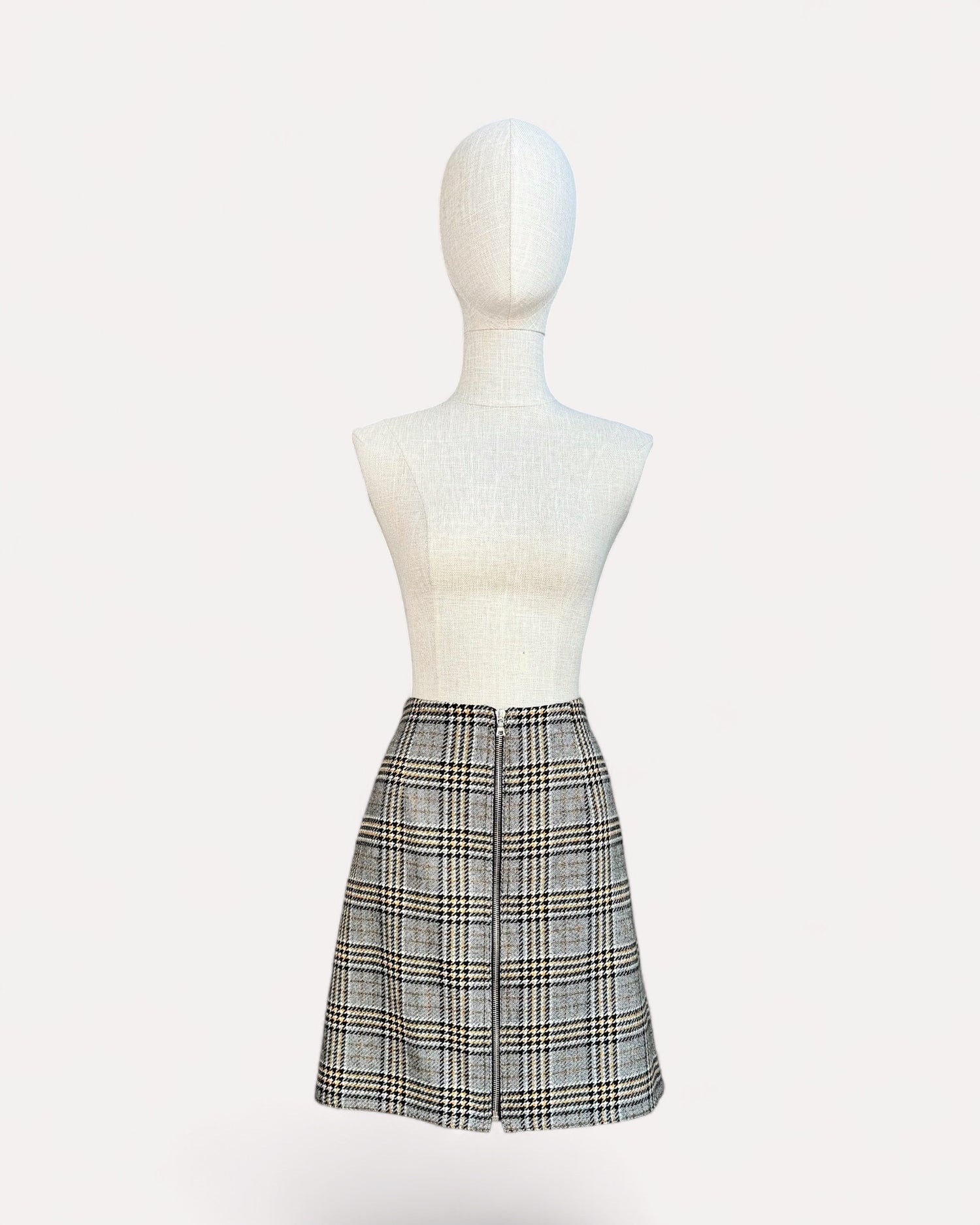 Jupe courte Judith & Charles à carreaux gris, noir et beige, coupe évasée avec zip discret à l’avant, une pièce chic et intemporelle