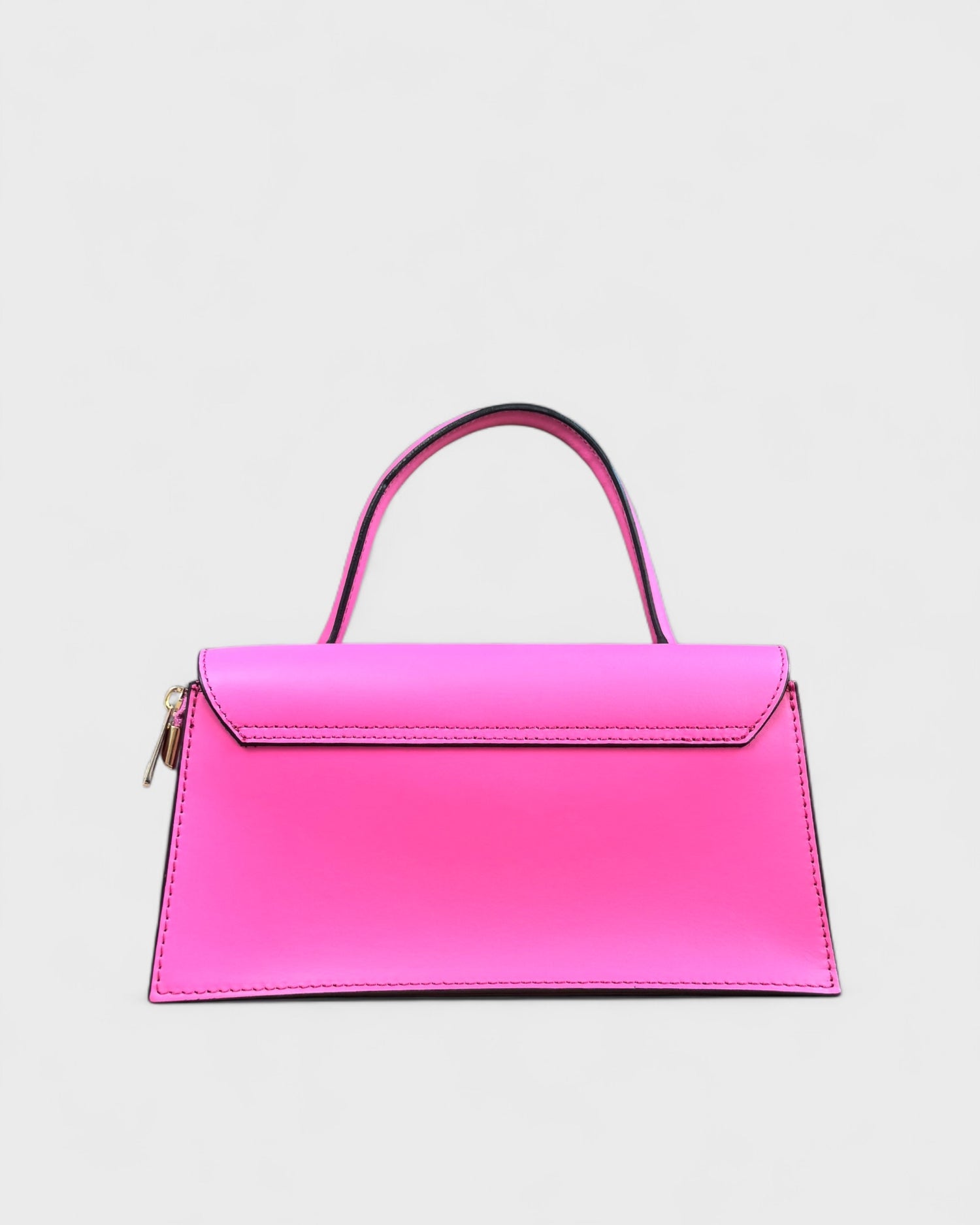 Petit sac en cuir rose vif de la marque Luana Ferracuti, au design structuré et moderne. Il se porte à la main ou à l'épaule grâce à sa bandoulière amovible. Fermeture à rabat avec bouton magnétique, intérieur doublé en suédine rose et compartiment zippé. Finitions soignées avec détails dorés. Un accessoire chic et audacieux, parfait pour apporter une touche de couleur à vos tenues.