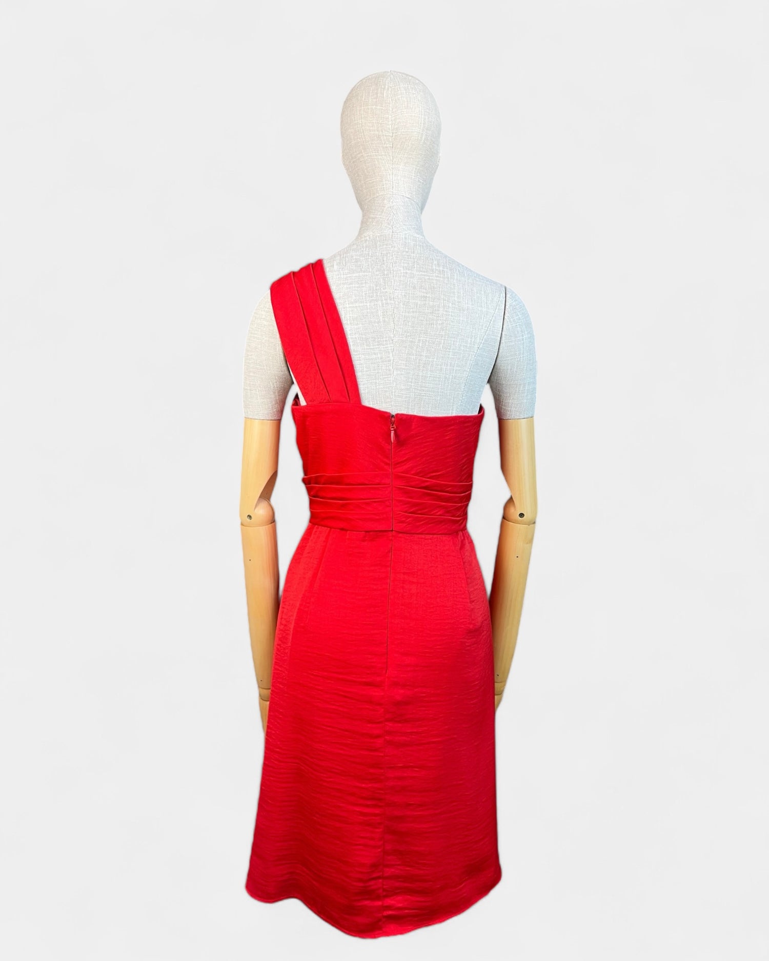 Cette robe rouge BCBG se distingue par sa coupe asymétrique avec une épaule découverte. Le drapé sur le devant et les détails plissés apportent du volume et du mouvement. Une fermeture zippée discrète à l’arrière assure un ajustement parfait. Un modèle idéal pour une tenue de soirée.