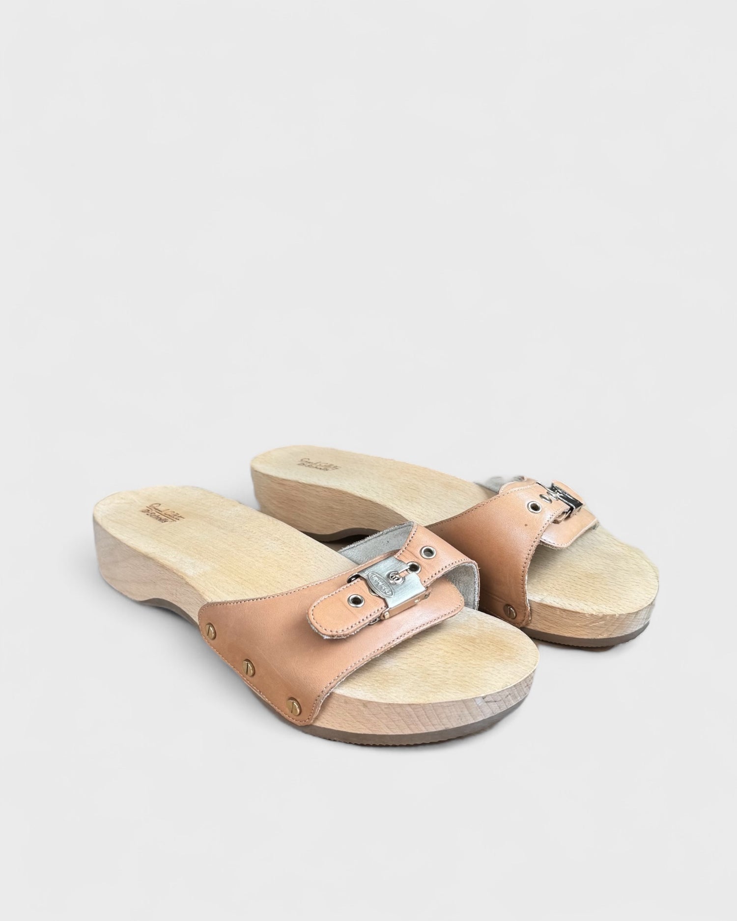 Sabots en bois clair de la marque Dr. Scholl, avec bride en cuir camel ajustable par boucle métal. Talon confortable légèrement compensé. Fabriqués en Italie. Petite griffure visible à l’arrière d’un des talons (voir photo). Un modèle classique et solide, parfait pour un look rétro ou naturel.