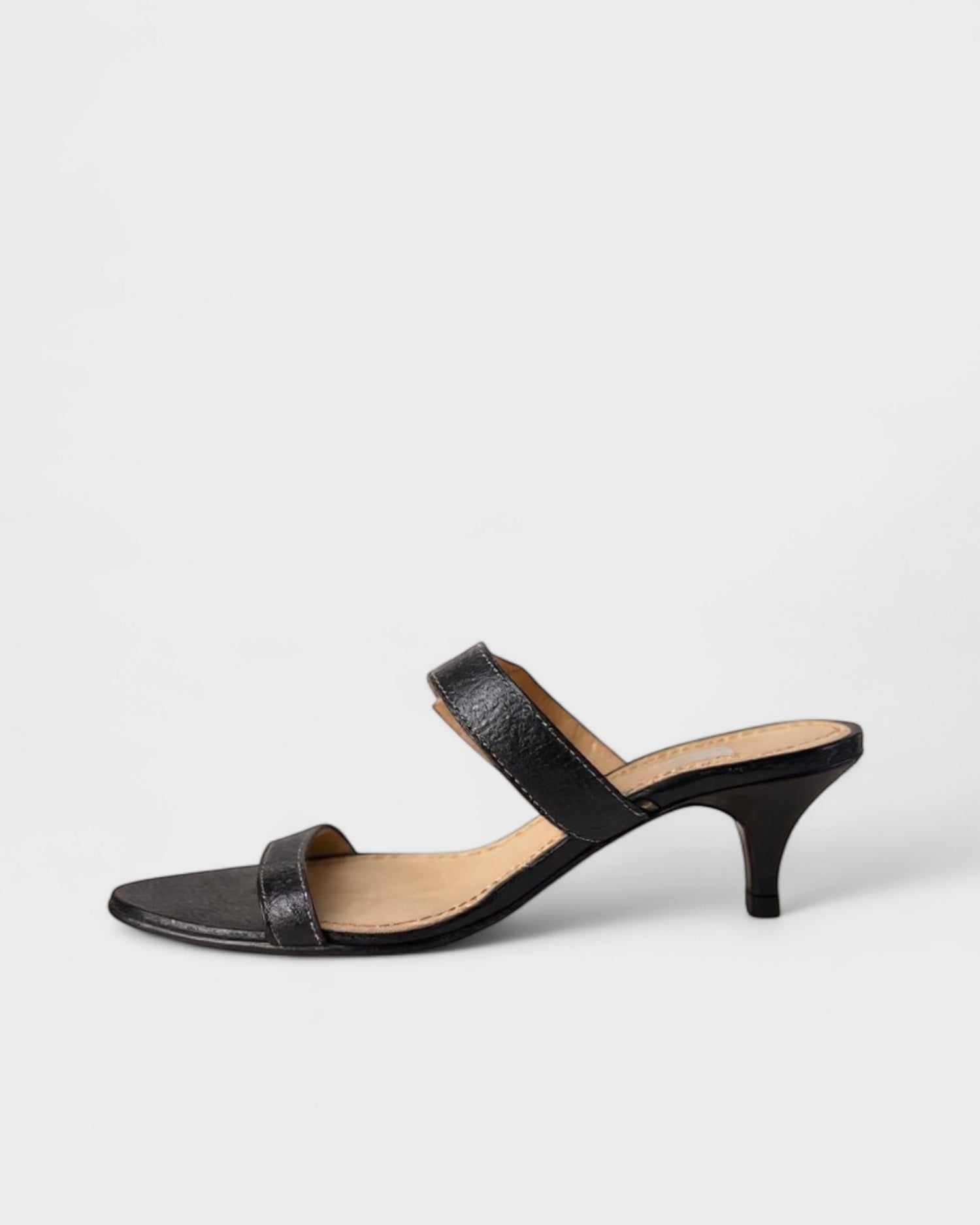 Modèle à enfiler, avec talon aiguille bas (kitten heel) d’environ 5 cm.