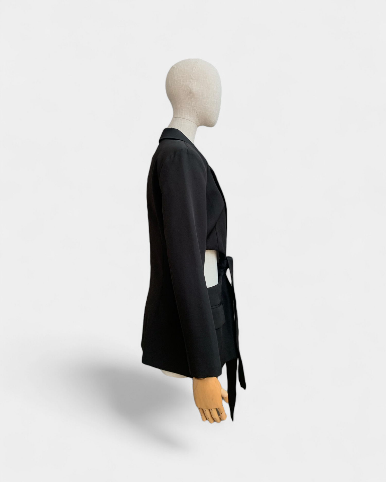 Veston noir structuré avec découpes latérales et ceinture à nouer. Il présente un col à revers, une poche poitrine et deux poches à rabat sur le bas. Les ouvertures sur les côtés apportent une touche originale. Coupe ajustée, manches longues.